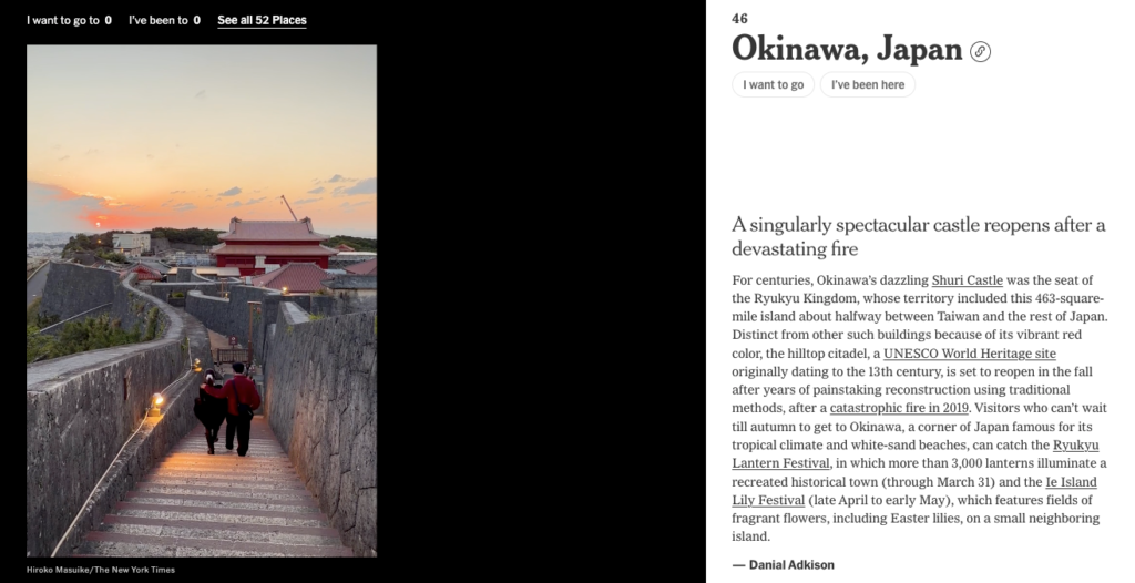 米ニューヨーク・タイムズ紙が発表した「2026年に行くべき52ヶ所」に、沖縄・首里城とともに琉球ランタンフェスティバルが紹介されました。